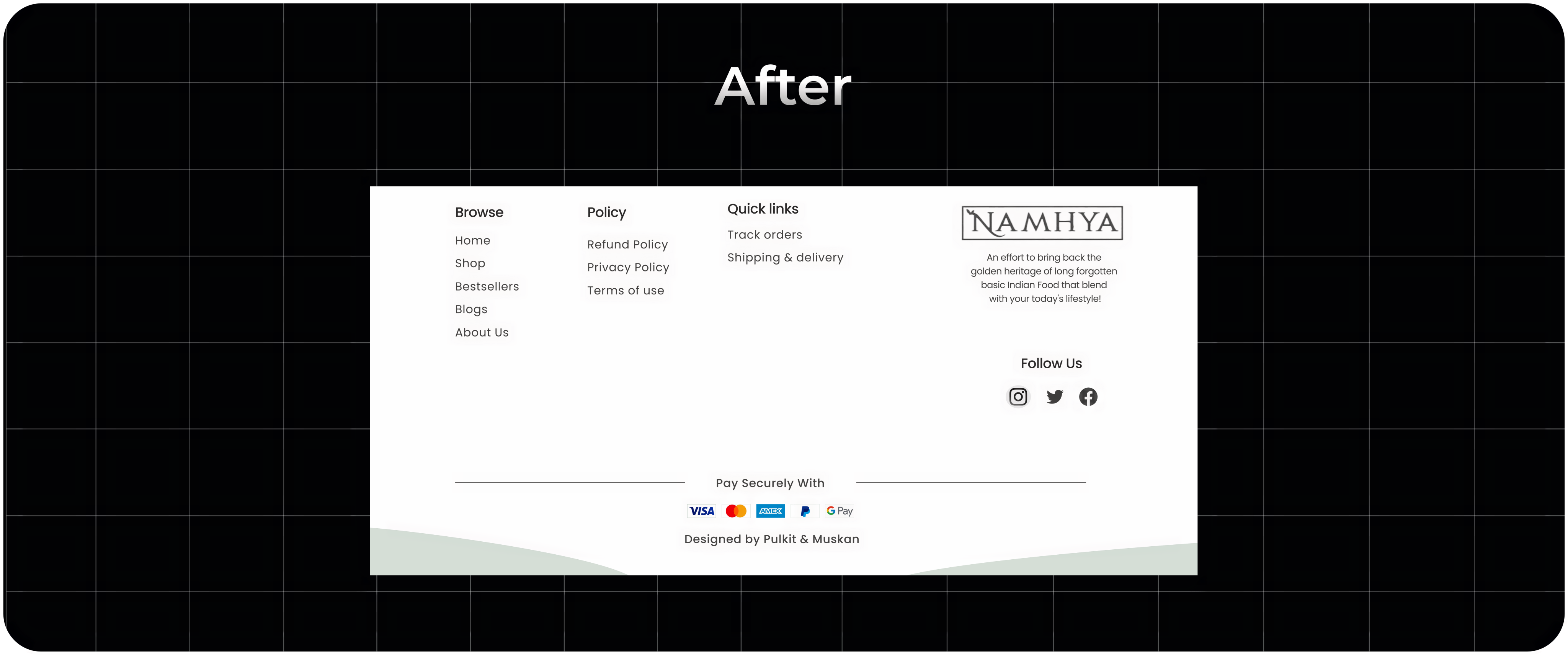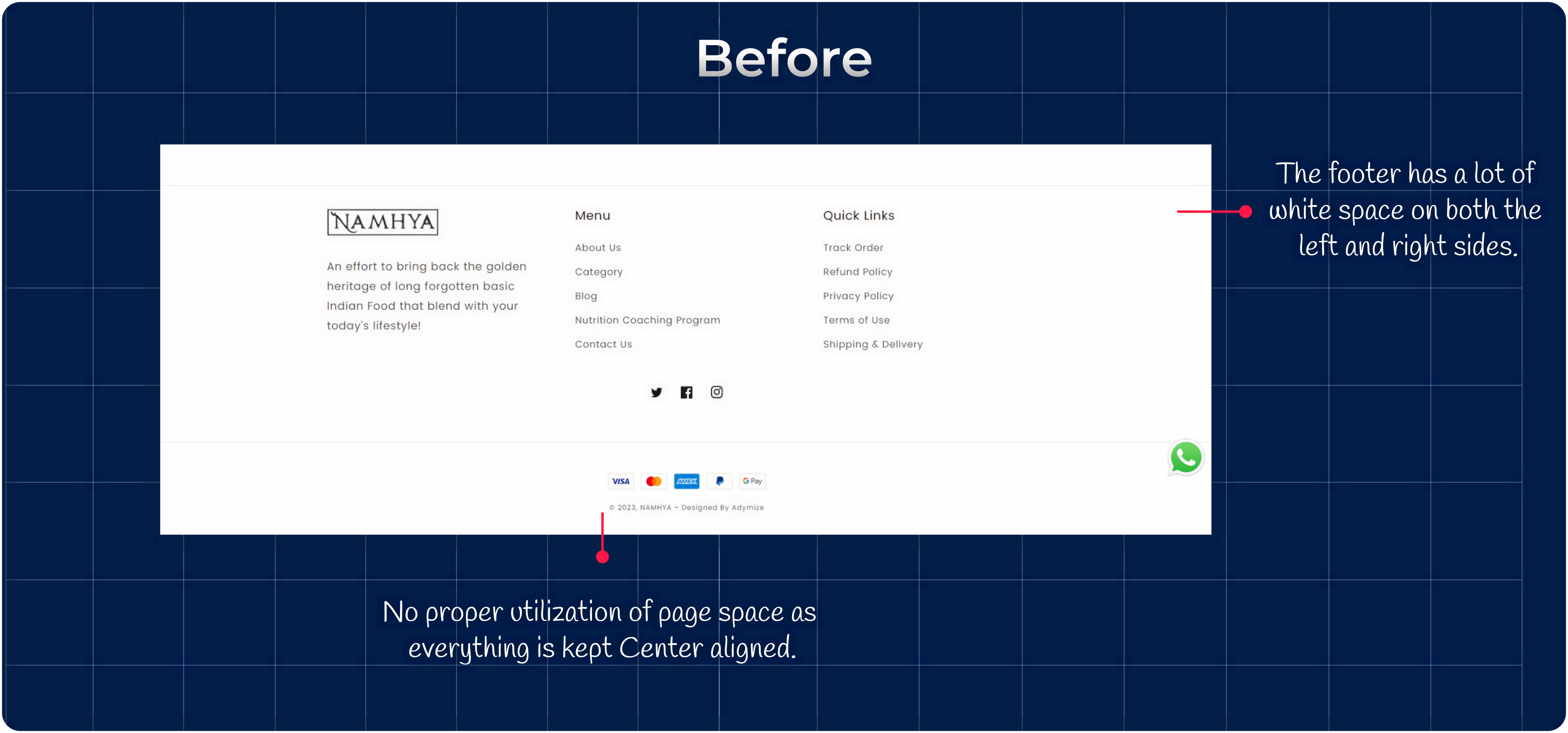 - When redesigning website footer, we used the page space effectively by placing text in prominent areas, making it easier for visitors to scan and understand.