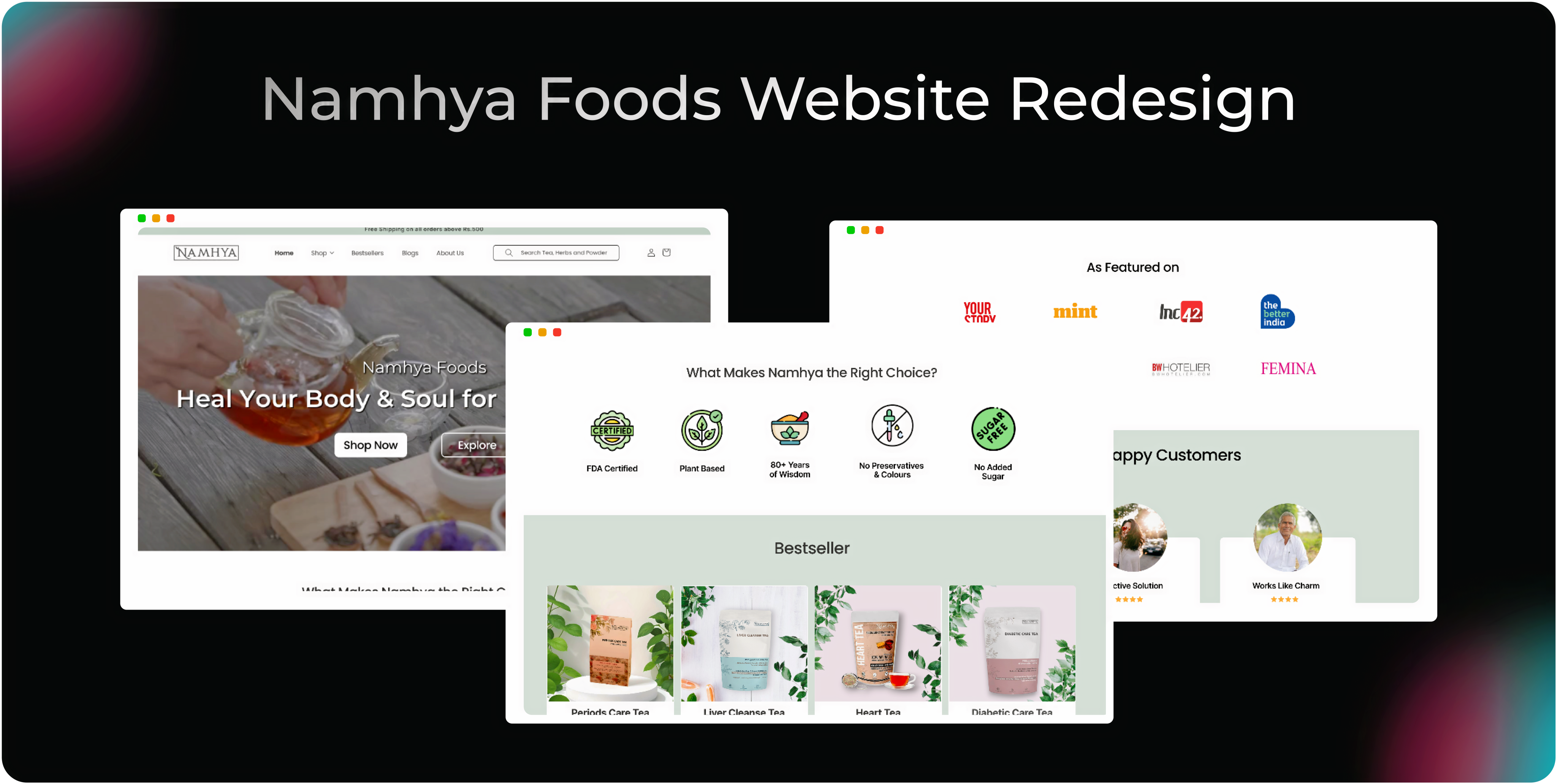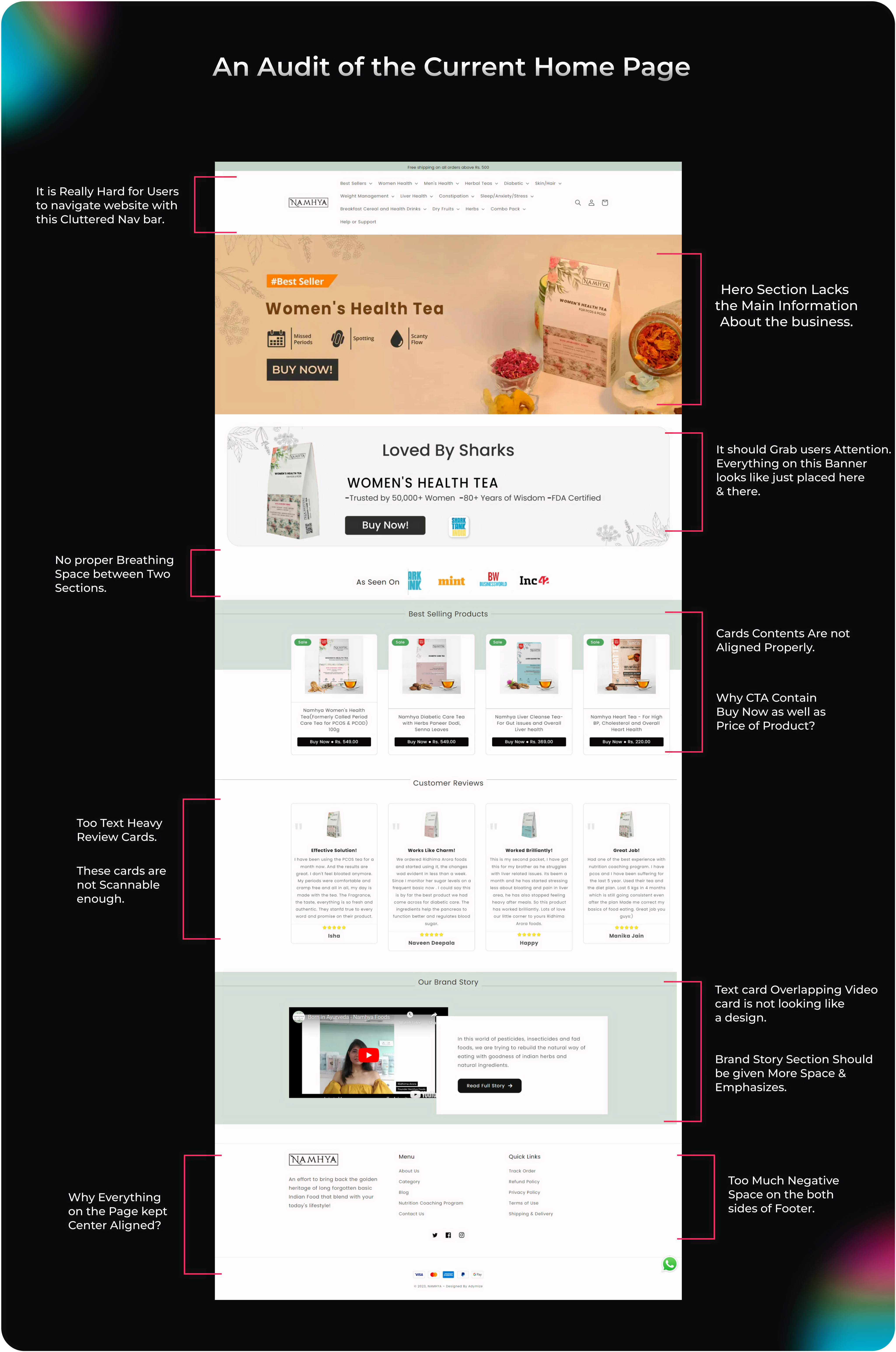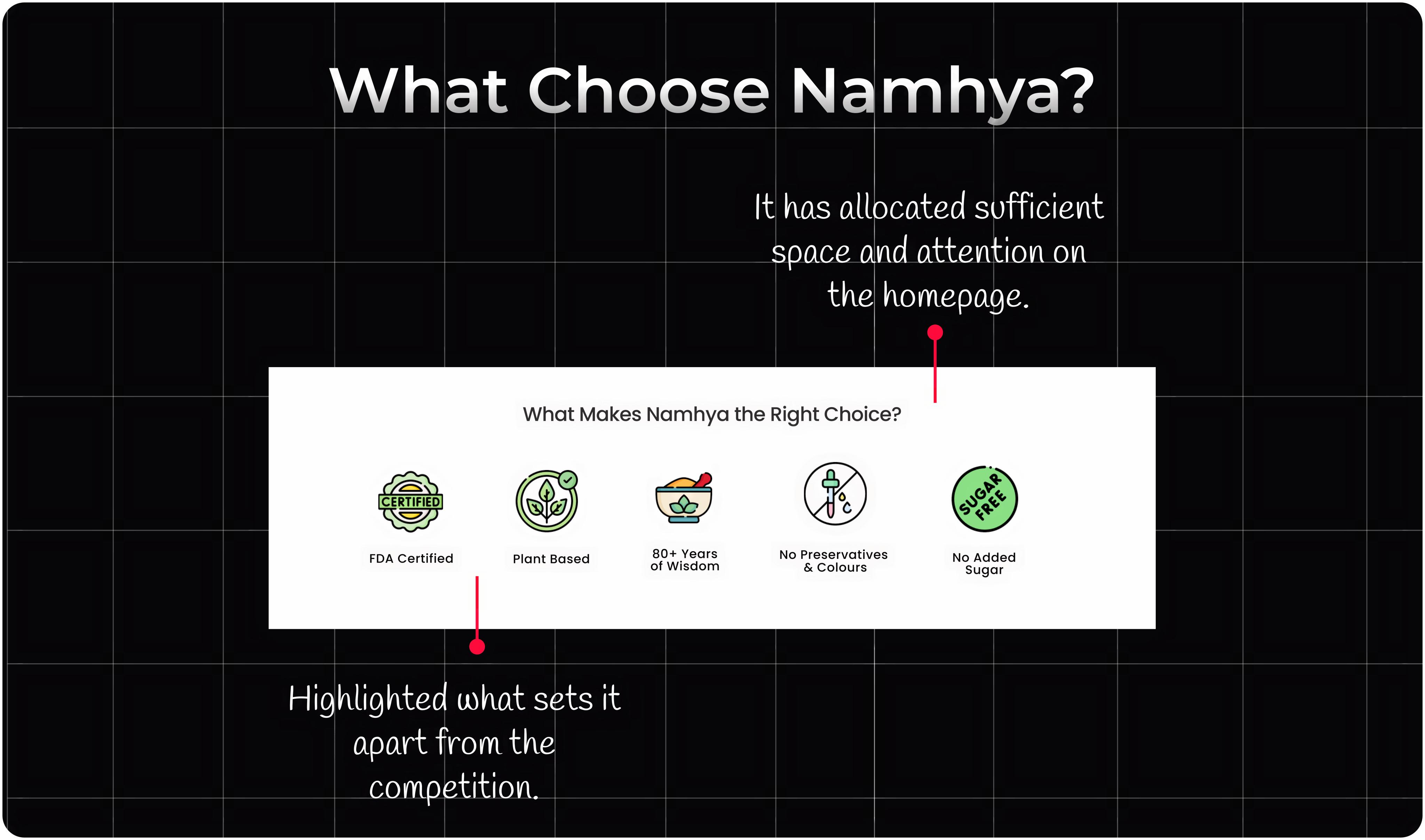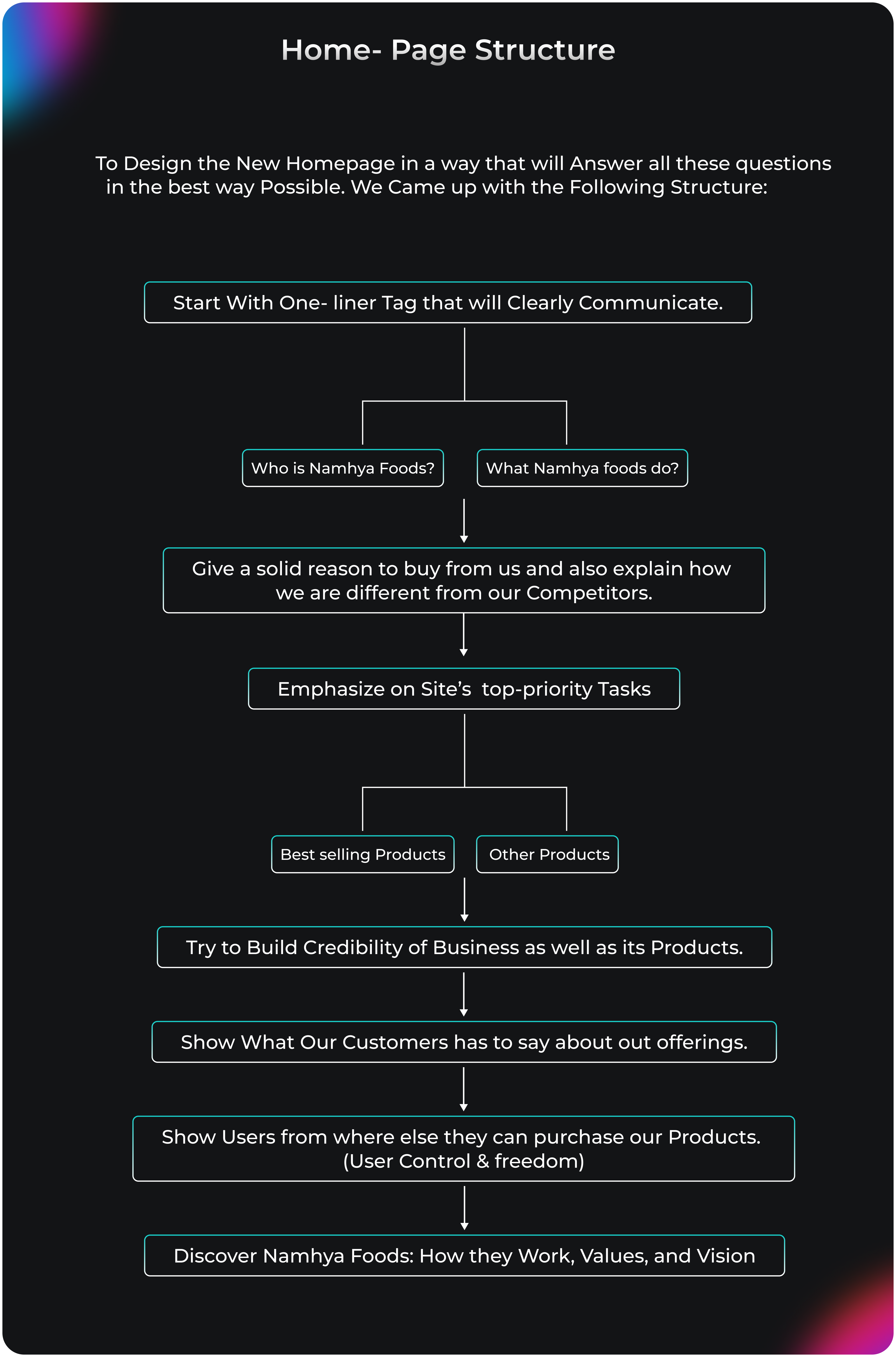 We took inspiration from our competitors' homepages and the latest e-commerce trends Based on & some other research to create a new homepage structure that is sure to be effective, User friendly, Easy to Navigate and Most Importantly tell users what Namhya foods is all about when they just land on their website.