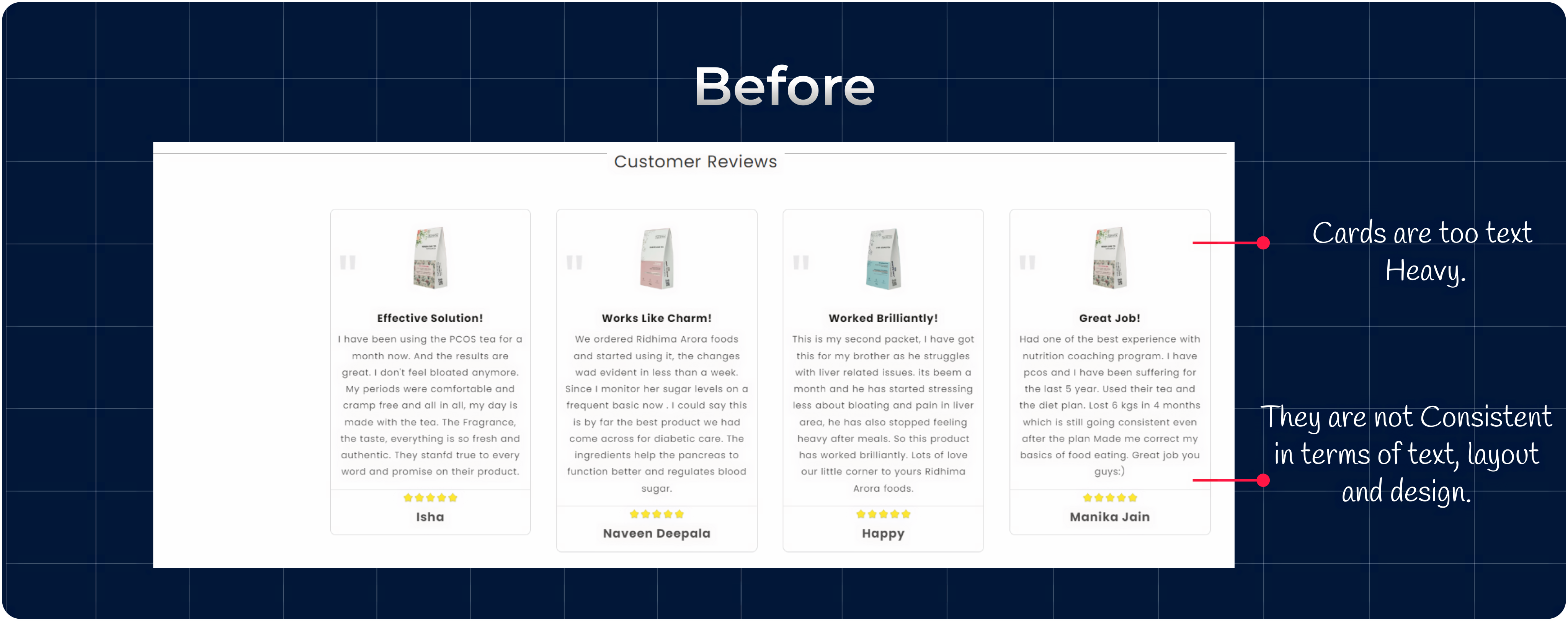 - Cards are too text heavy: As it is an Ecommerce website users want to see what others have to say about product & business, but they don't have too much time to go read such a text heavy review and these cards are not scannable enough.