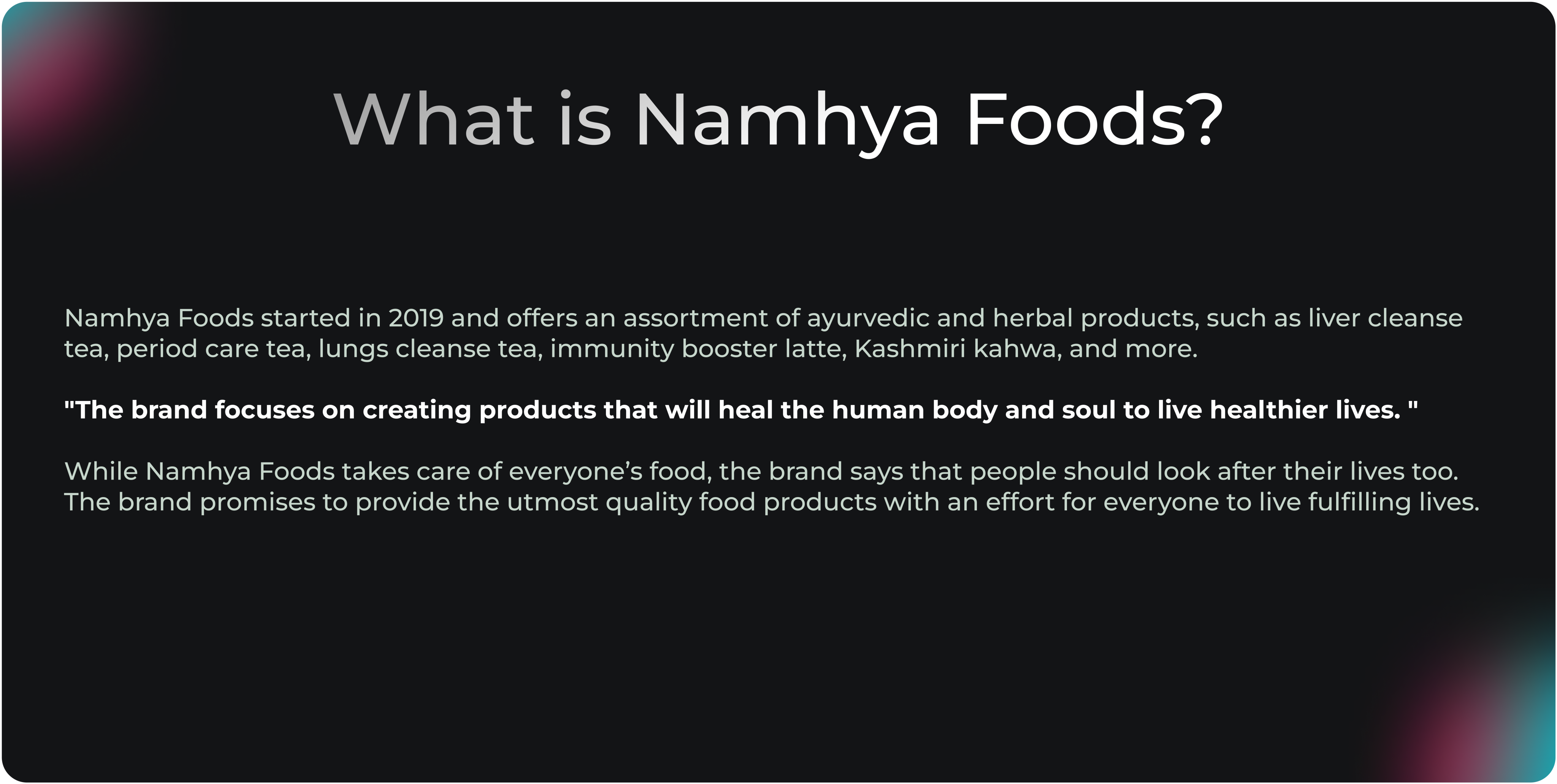 - We created a new hero section banner for Namhya Foods that includes a one-sentence tagline that Concisely communicates what the company is and how it can benefit users.