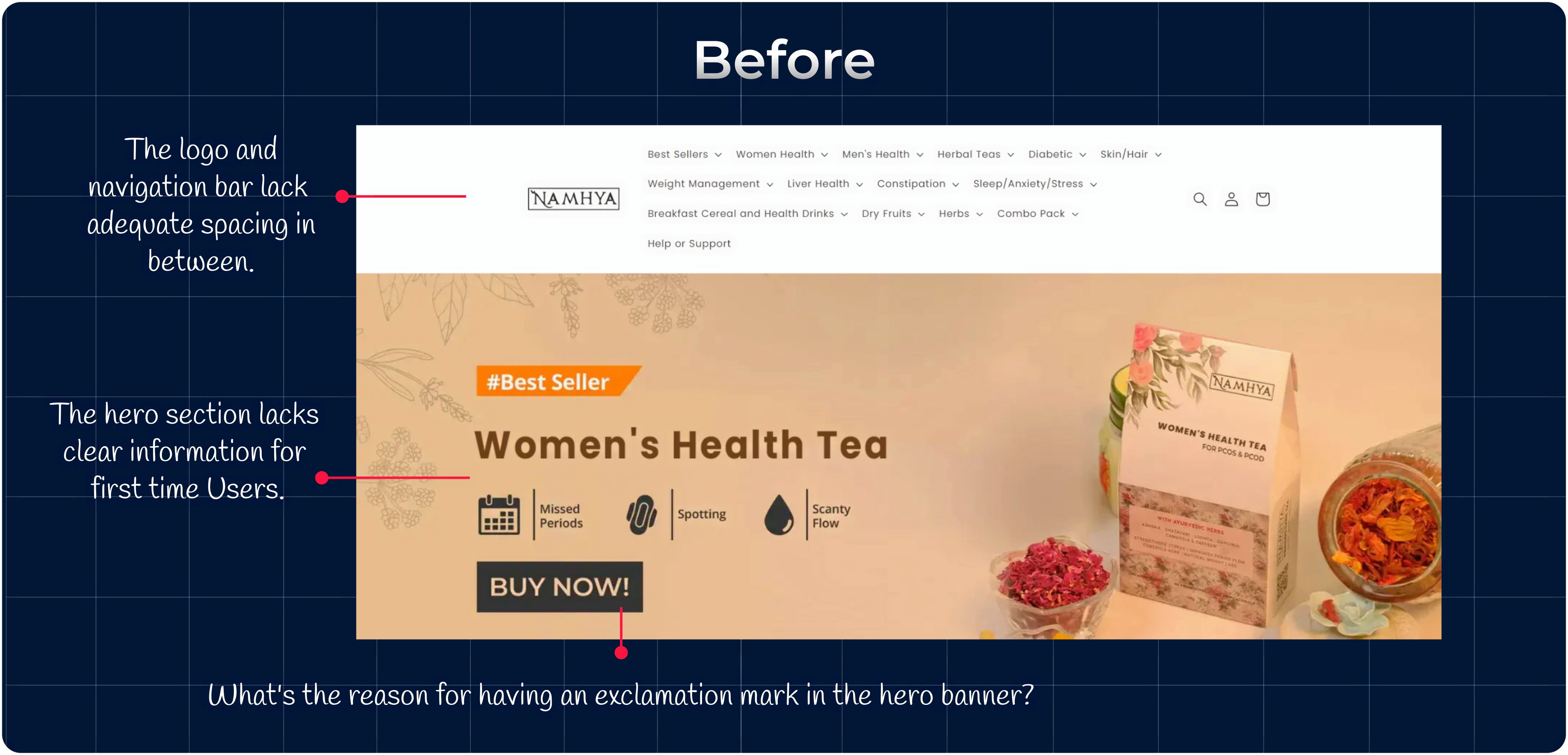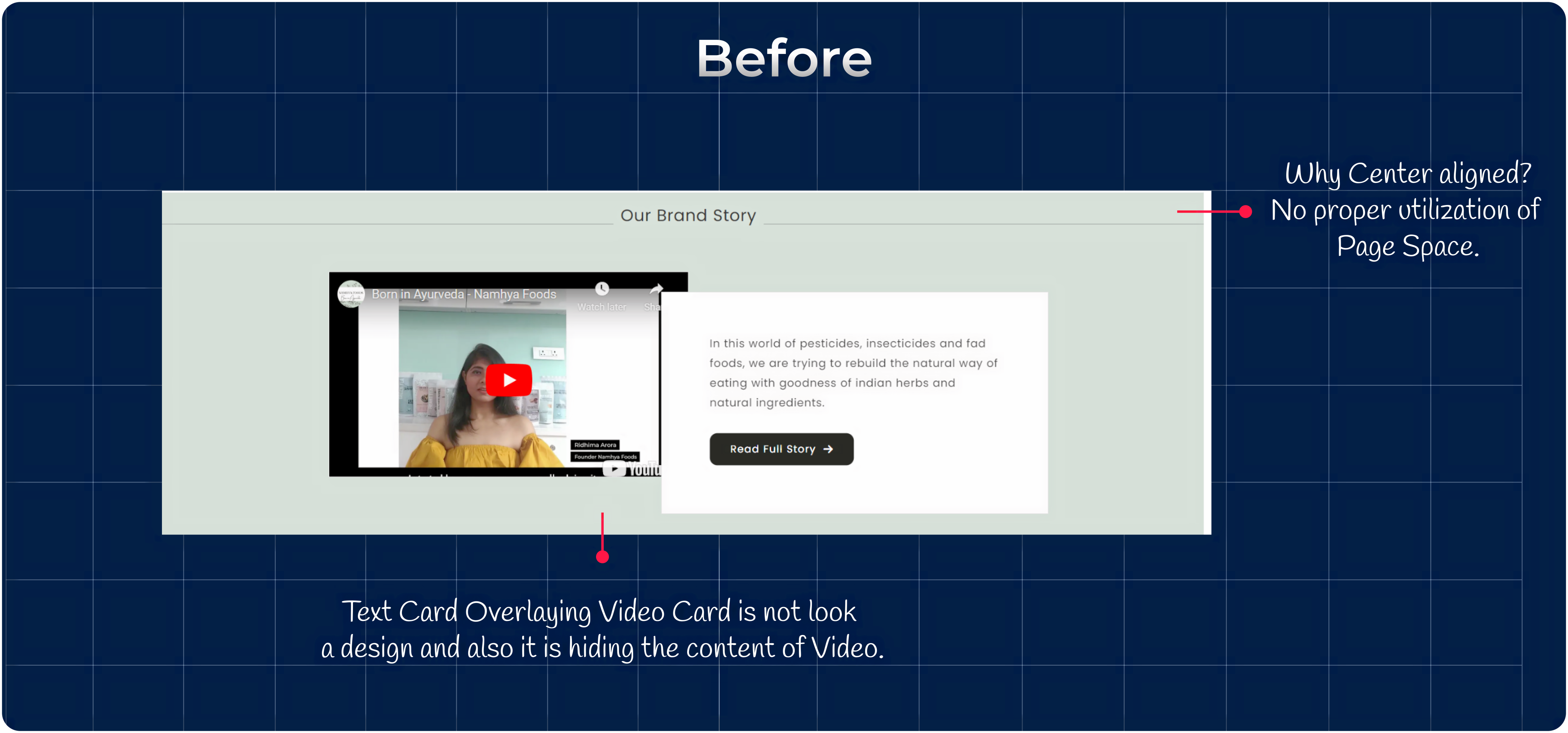 - Centered content of Namhya brand story: Creates excessive negative space on both sides of the page. This made the page feel unbalanced and cluttered, and it made it difficult for users to scan the content.