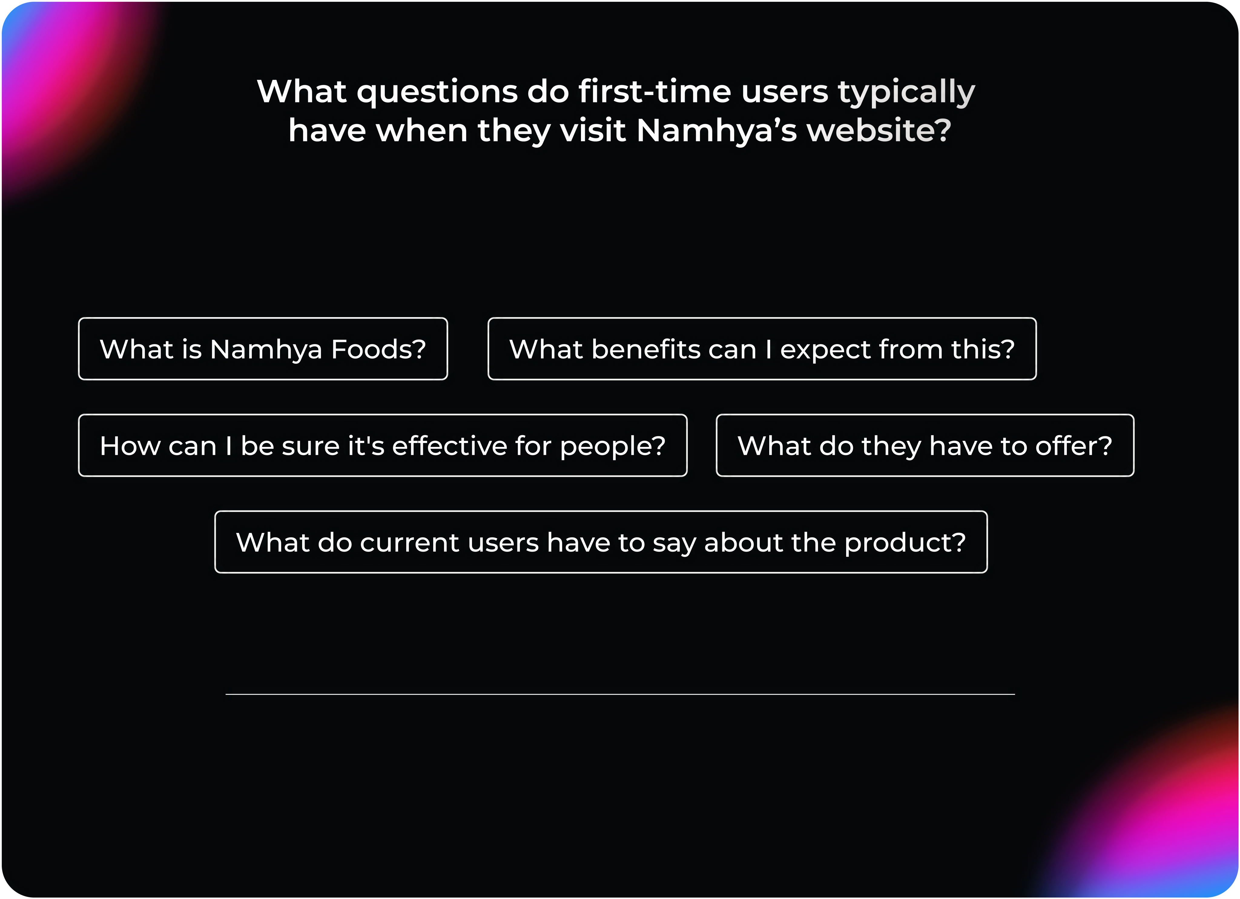 After analyzing competitor websites and conducting secondary research, we identified some common patterns and questions that first-time visitors have about business, products, credibility, and customer reviews. Here are some of the questions that first-time visitors have: