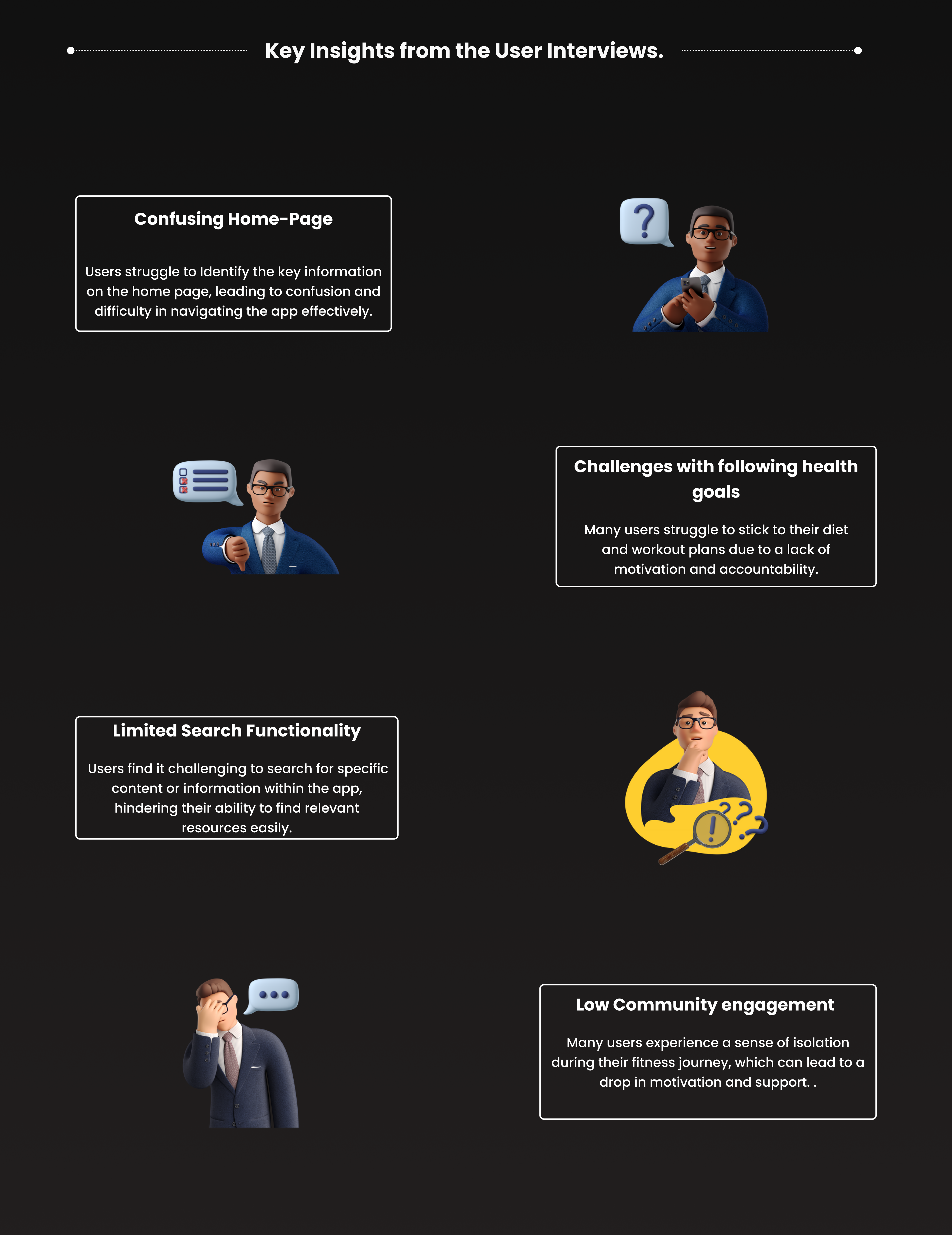 We started our user research by conducting user interviews with 5 users, which vary from daily active users to infrequent users of the HealthifyMe app to understand what motivates or demotivates them to continue their Fitness journey and achieve their Fitness Goals.